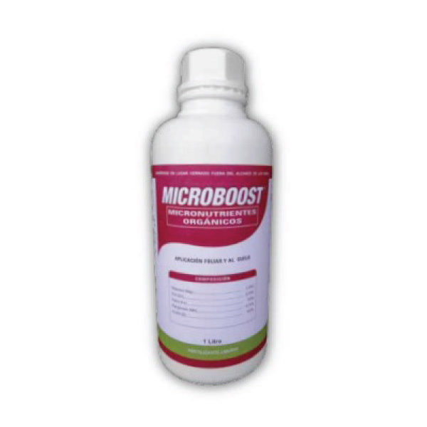 MICROBOOST ORGANIC es un micronutrientes orgánico que sirve como corrector de deficiencias de micro elementos que la planta no disponga lo que le permite tener un equilibrio ya sea con los macro y micro elementos lo que permite tener una buena cantidad de raíces, hojas flores y frutos de buena calidad. También actúa como un catalizador para que todos los procesos metabólicos que la planta realiza sean equilibrados y que no tengan ningún problema en el desarrollo de la misma. Con el equilibrio que nos da el manejo de los micro elementos podemos decir que las planta puede soportar de mejor manera los estrés sean estos hídricos, de medio ambiente, por uso inadecuado de fungicidas insecticidas etc.